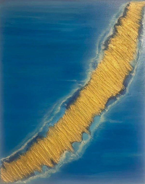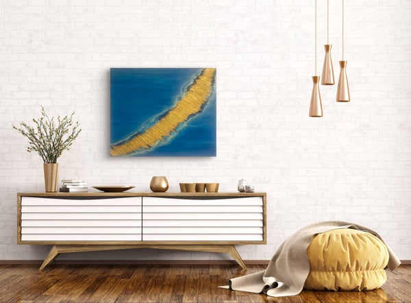 Ein ausdrucksstarkes, abstraktes Acrylbild in leuchtenden Blautönen mit goldenen Akzenten und lebendiger Struktur. Es bringt die Kraft und Schönheit des Meeres direkt in dein Zuhause und schafft eine besondere Atmosphäre.